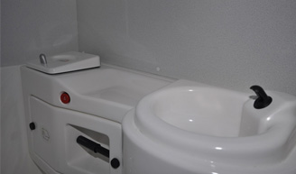 El Baño está hundido en el piso del vehículo y es accesado a través de la escalera de salida..